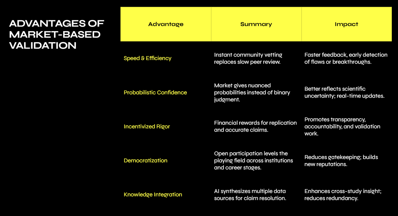 Historically, the peer-reviewed paper served as science’s epistemic checkpoint. But its limitations are now manifest: reproducibility failures, entrenched conservatism, and delays incompatible with today’s information flows. The peer review process, intended to filter rigor from noise, often becomes a bottleneck that stifles heterodoxy and slows innovation. In contrast, prediction markets offer a real-time epistemic ledger, where the credibility of claims is priced dynamically, with AI assessing incoming evidence to resolve outcomes. In this system, scientific trust is no longer granted ex-ante by reviewers but earned ex-post through open evaluation.