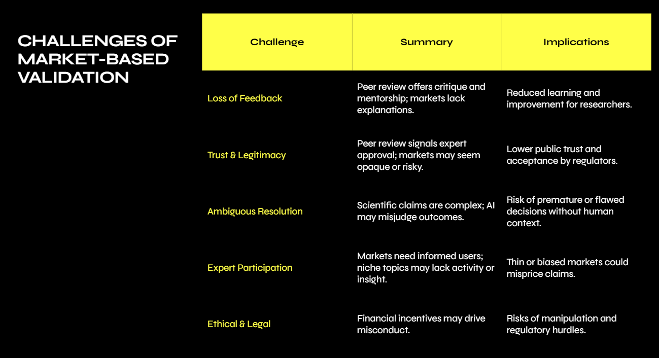 🟡Public Perception: Peer-reviewed publications carry an implicit expert endorsement. Replacing them with AI-set probabilities might seem like gambling to some, undermining public trust and regulatory acceptance. Without transparency and explanations, markets may struggle to gain authority.